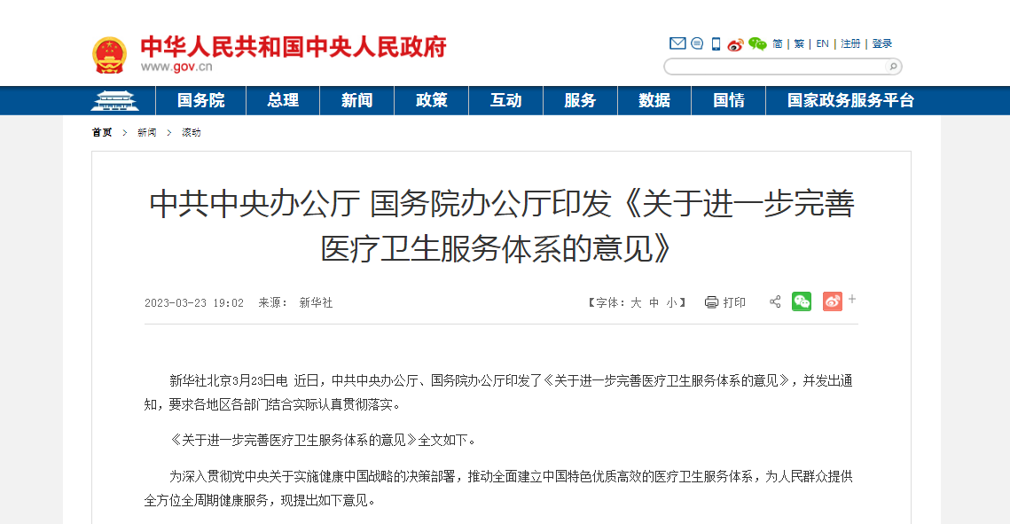 近日,中共中央辦公廳、國務院辦公廳印發(fā)了《關于進一步完善醫(yī)療衛(wèi)生服務體系的意見》(以下簡稱《意見》),并發(fā)出通知,要求各地區(qū)各部門結合實際認真貫徹落實。